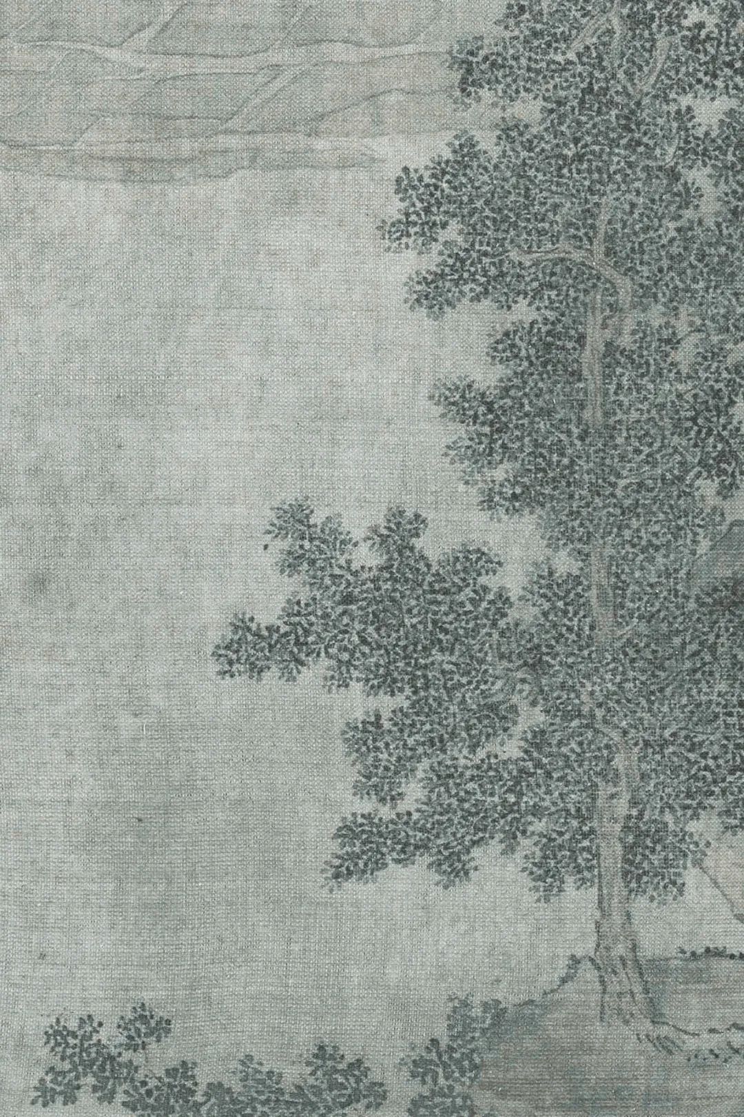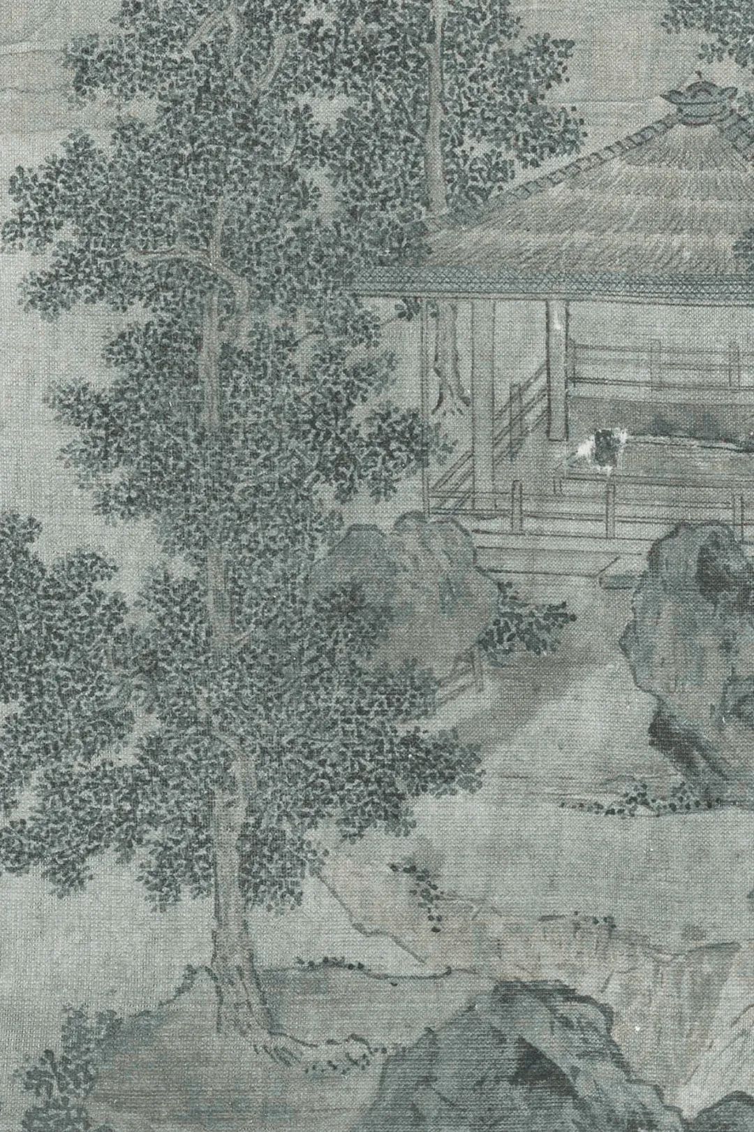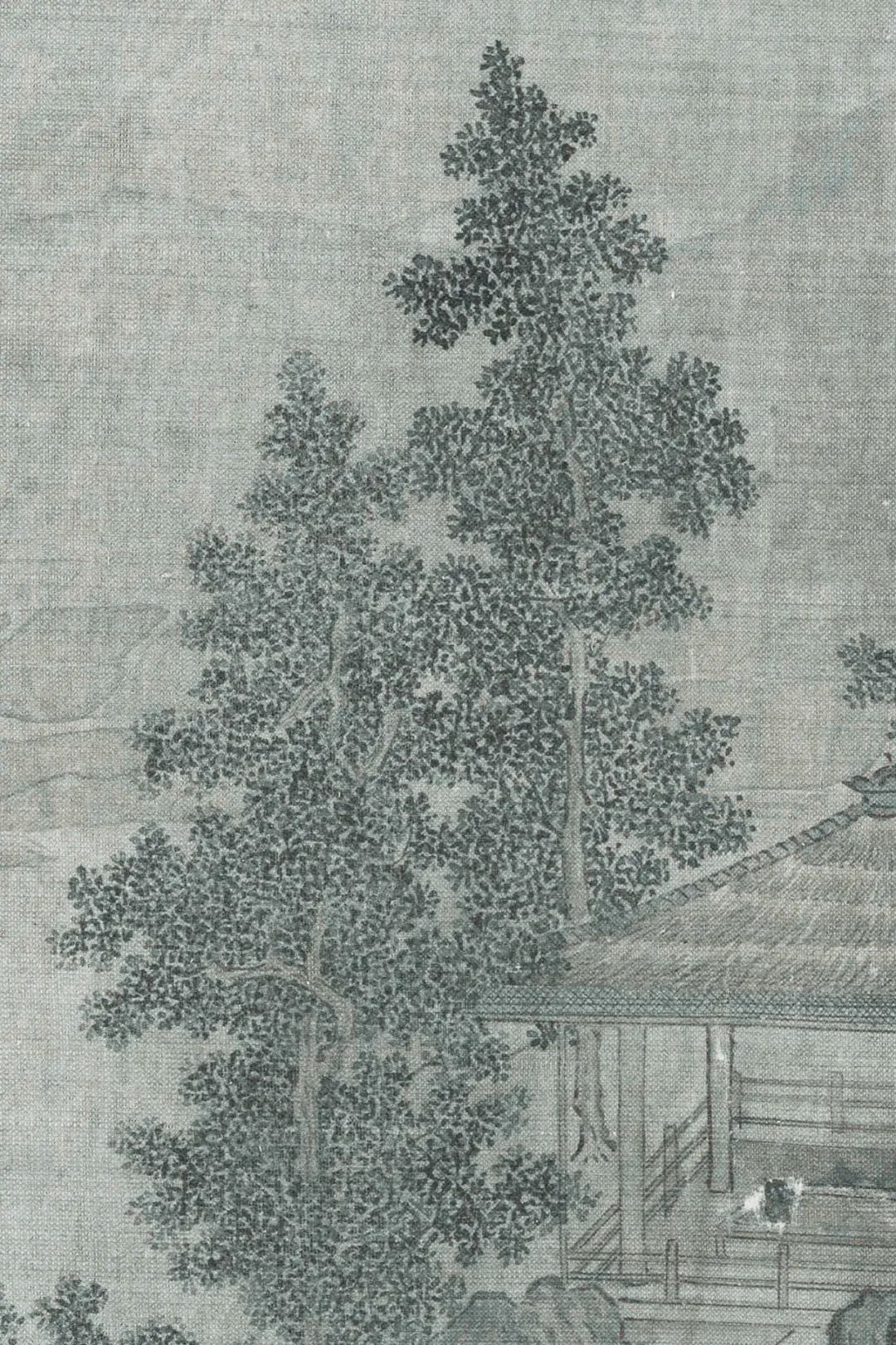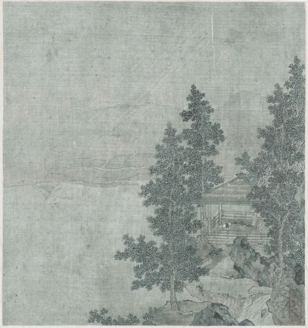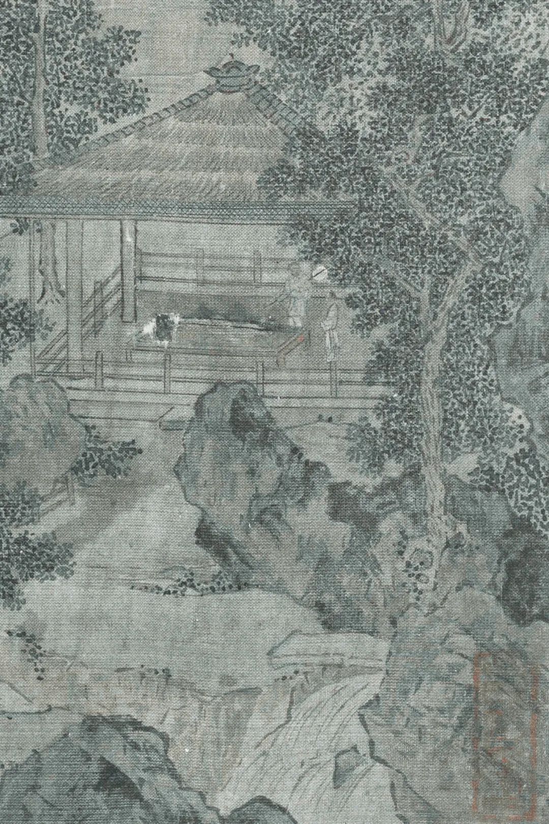 画中远山“空蒙”、云天“苍茫”,这些留白处并非单纯的构图需要,而是对自然不可控性的暗示。当文人试图用水阁、古木、奇石将自然纳入自身秩序时,远山与云天始终以模糊、流动的形态,拒绝被完全驯化。这种空白与画中精细的建筑、人物形成张力,暗示着自然对人类权力游戏的隐性反抗——文人可以建造水阁,却无法控制山雾的聚散;可以移植古木,却无法阻止溪涧的改道。